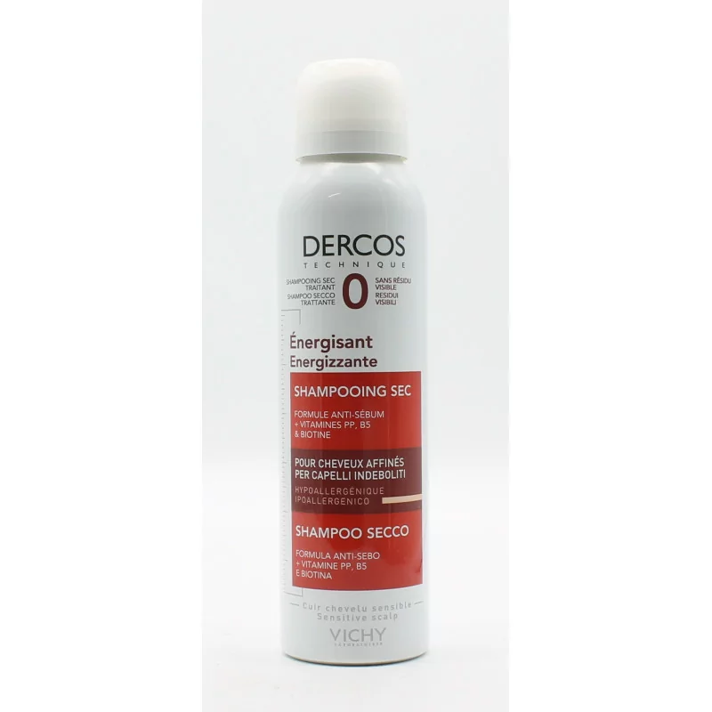 Le shampooing sec énergisant de Dercos possède une action anti-sébum grâce à sa formule enrichie en vitamines PP, B5 et Biotine. Son utilisation ne laisse aucun résidu visible.